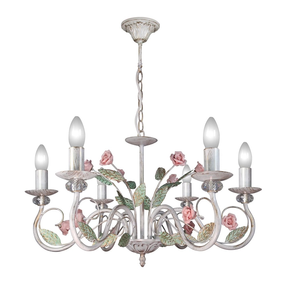 Люстра подвесная с розами розовыми и листочками классические гладкие чашки хрустальные вставки российского производства ПЕТРАСВЕТ S1288-6, 6хЕ14 макс, 60Вт, цепь можно укоротить до 1 звена на 17 см, стиль - классика свечи, арматура - металл, цвет светильника- белый с патиной золота, размеры светильника (LxWxH) - 62x62x62, вес - 1,6 кг, Люстра на 2 включения, Люстра подвесная и для натяжных потолков и освещение 18-25 м2 помещения в зависимости от мощности лампочек Е14, Все светильники свечи с цветами листьями подходят и для натяжных и подвесных потолков, Люстра подвесная цепная 5 и 6 рожковая с цветами керамическими в детскую комнату для девочки подходит для освещения кабинета, гостиной, спальни, столовой, детской, кухни, Заводская гарантия 7 лет, Люстра просто собирается, Лампочки светодиодные LED подбираются по следующим параметрам: для яркого освещения - 3 Вт на 1 м2 комнаты, для среднего - 2 Вт на 1 м2, В случае боя или не комплекта, мы вышлем Вам новый в день обращения за наш счет, Можно докупить абажур, который крепится на лампочку,